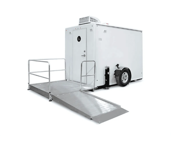 Experience the accessibility and comfort of our 1-stall ADA restroom trailer. Designed for easy navigation, this trailer comes with a ramp that has a very slight angle and a generously sized platform.